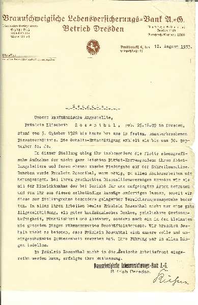 Entlassungszeugnis für Elisabeth (Lissy) Rosenthal vom 12. August 1933