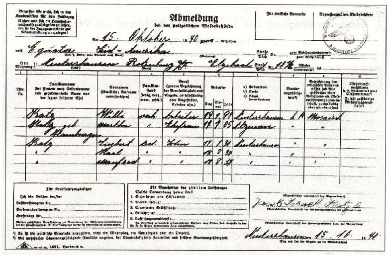 Polizeiliche Abmeldung in Nentershausen am 15.10.1940 von Willi und Martha Katz sowie ihrer Söhne Siegbert, Karl und Manfred mit der Adresse Elzebach 181/2 (Konfession: Mosaist).