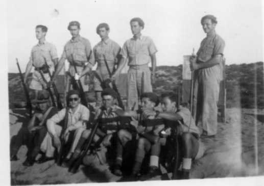 ganz links) mit anderen bewaffneten Mitkämpfern der Hagana in