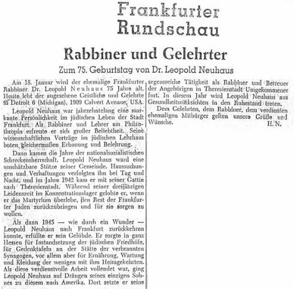 hatte Leopold Neuhaus zu seinem 75. Geburtstag am 18. Januar 1954 mit einem Artikel gewürdigt - knapp vier Monate vor seinem Tod am 10. Mai 1954.