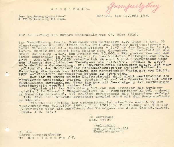 Novemberpogromen 1938 an privat verkauft - mit notariellem Vertrag vom 19.12.1938. Die Stadt Rotenburg machte
