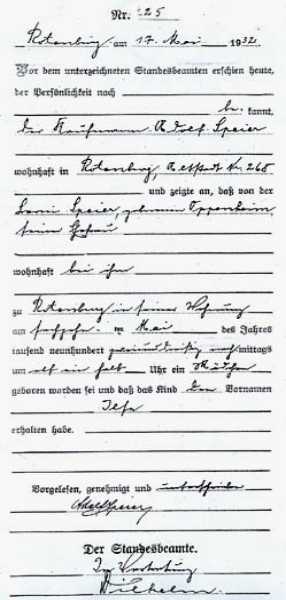 Vom Standesamt Roten-burg ausgestellte Geburts-urkunde von Ilse Speier,