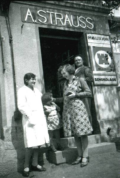 Luise Bodesheim mit Milly vor der Eingangstür zum Laden mit zwei weiteren unbekannten Personen