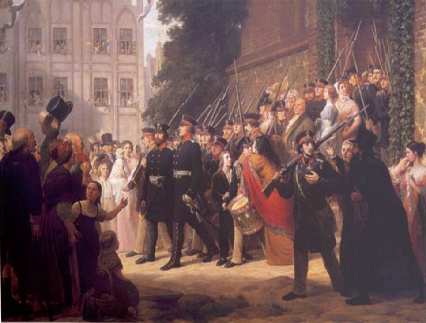 Landwehrmänner gekleidet und ausgerüstet, reiht sich
