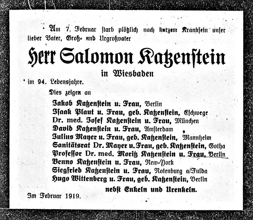 Die Todesanzeige für den verstorbenen Salomon Katzenstein. Salomon K. starb am 7. Februar 1919 in Wiesbaden. Siegfried Katzenstein übernahm den