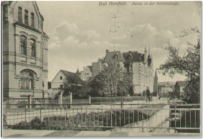 Reichsstraße im Jahr 1915 (Postkarte) Das hohe Gebäude rechts (Reichsstraße 1) ist das Elternhaus von