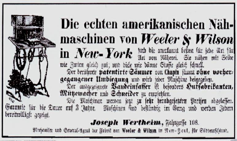 Geschäftsanzeige der Firma Jos. Wertheim aus dem Jahr 1862