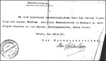 Aus Australien schickte uns Johanna Oppenheim, die Tochter des im Sommer 1939 nach dort geflüchteten Leo(pold) Oppenheim (bis dahin Pfarrstarße 21), eine von Levi Oppenheim, dem letzten Synagogenältesten ausgestellte Bescheinigung, die das Siegel der Bebraer jüdischen Gemeinde zeigt.